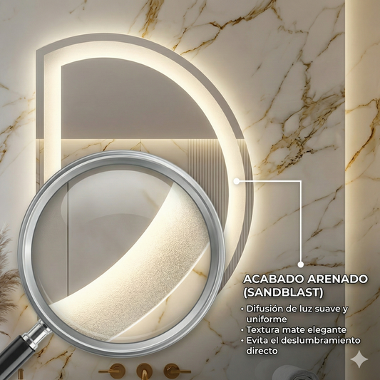 El espejo Cápsula es perfecto para quienes buscan un diseño diferente y sofisticado. Su acabado arenado sandblast proporciona un efecto visual único y elegante, mientras que la iluminación LED de tres tonos te permite crear el ambiente perfecto. Ideal para baños modernos, peinadoras de lujo y espacios comerciales que buscan destacar con estilo contemporáneo.
