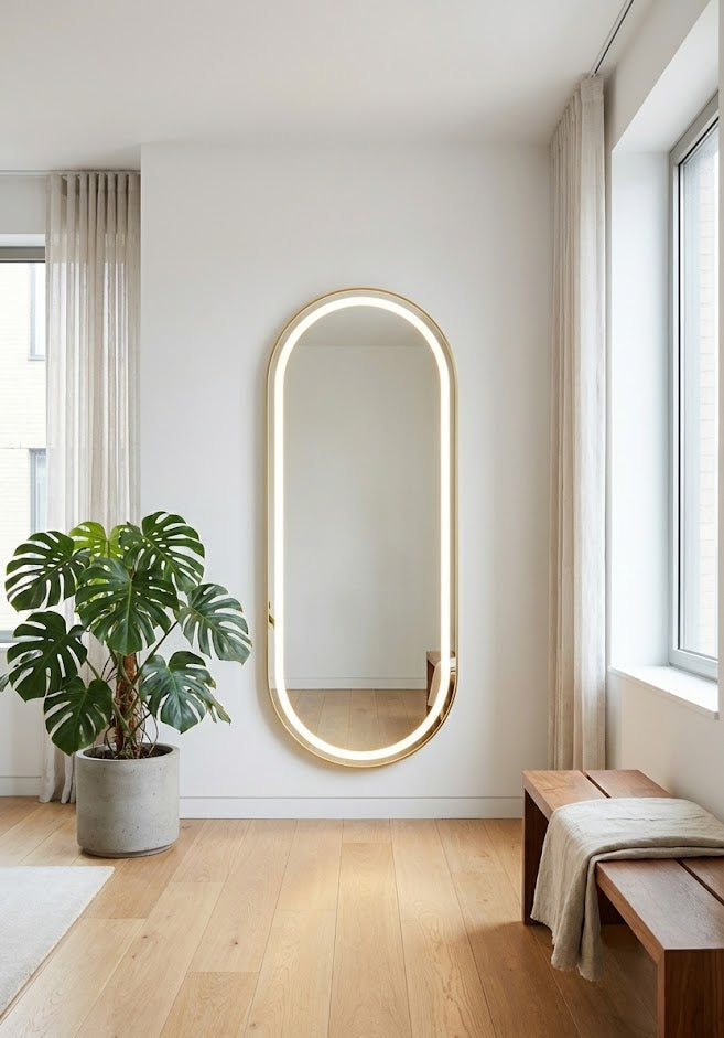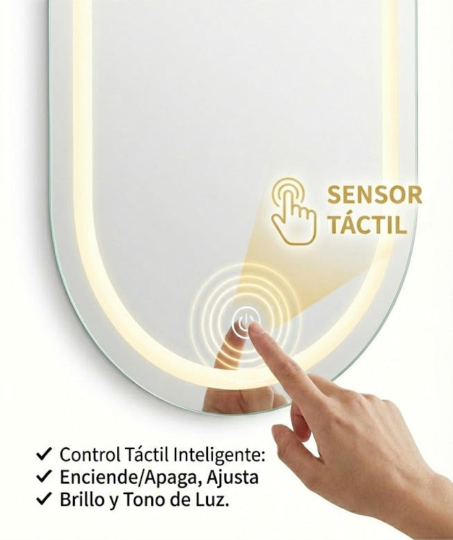 El espejo Cápsula es perfecto para quienes buscan un diseño diferente y sofisticado. Su acabado arenado sandblast proporciona un efecto visual único y elegante, mientras que la iluminación LED de tres tonos te permite crear el ambiente perfecto. Ideal para baños modernos, peinadoras de lujo y espacios comerciales que buscan destacar con estilo contemporáneo.